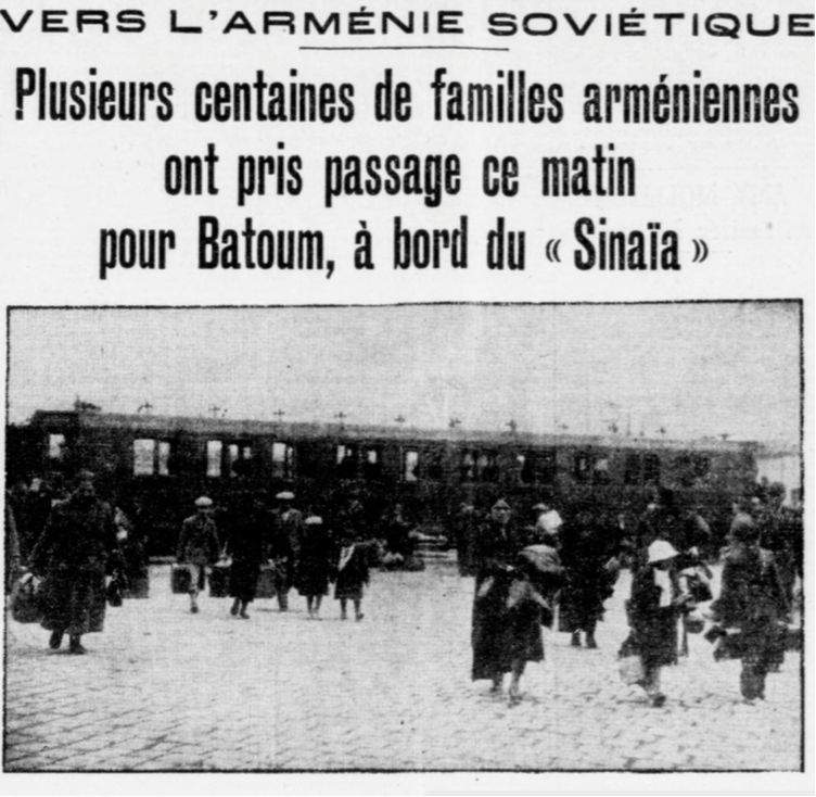 NEWS FROM MARSEILLE: ARMENIANS TO BE REPATRIATED HAVE BOARDED THE SINAIA (By telegram from our private correspondent) Marseille, 9 May. The Armenian repatriates who arrived in Marseille yesterday boarded the Sinaia, moored at Abattoir Pier. The liner will sail at 5 p.m. The embarkation took place in the midst of complete calm, under the supervision of Mr. Chaverdian, Minister Plenipotentairy of the Government of Erivan, in charge of emigration, and Mr. Avikian, who heads the Armenian refugee office in our city. The important security service that was operating on the quays did not have to intervene. The passengers of the Sinaia will disembark at Batum and from there, by rail, they will be directed to their new and final destination. Other expatriations will follow this one. Thousands of people will thus return to their homeland and work for its rebirth.